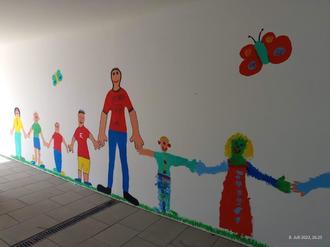 Herr Ermtraud richtete seinen Dank an all' die fleißigen Helfer des Förderverein Knirps e.V., welcher dieses Jahr der Veranstalter war. Als Träger wurde Er auf unserer Außenwand verewigt, umgeben von seinen Pänz - den Kindern der KiTa St. Suitbert im Herzen von Rheinbrohl.