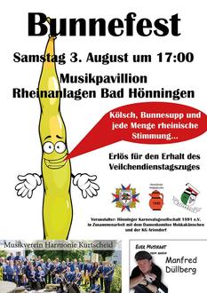Wie im Vorjahr wird zu Beginn um 17 Uhr ein Kurkonzert des Musikvereins Harmonie Kurtscheid stattfinden. Dieser konnte bereits beim letztjährigen Konzert beim Bunnefest das Publikum begeistern, sodass die Ausrichter sich freuen, die Gruppe abermals in den Sommerferien verpflichten zu können.