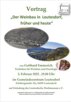 Der Verein Leutesdorfer Dorfmuseum e.V. lädt am 3.2.2023 um 19 Uhr zu einem Vortrag zum Thema „Der Weinbau in Leutesdorf, früher und heute“ ins Gemeindezentrum in Leutesdorf ein. Als Referent konnten die Organisatoren Gotthard Emmerich, Techniker für Weinbau und Önologie, gewinnen. Winzer Gotthard Emmerich wird über die ersten Nachweise und Erwähnungen von Leutesdorf und dessen Weinbaus seit der Römerzeit berichten. In einer kleinen Zeitreise wird er den Zuhörern die Entwicklung der Rebflächen, der Leutesdorfer Güter, der Rebsorten, der Arbeit des Winzers und weitere Aspekte näherbringen.