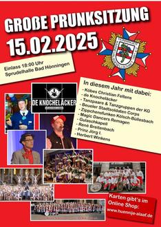 Der Vorverkauf für die Prunksitzung am 15. Februar 2025 wurde im November offiziell gestartet. Der Kartenpreis beträgt 22 € Euro. Katen können im Online-Shop der Hünnijer KG (unter https://shop.huennije-alaaf.de/) erworben werden.
