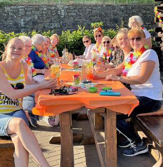 Viele Möhnen hatten sich passend bunt gekleidet und erhielten überdies noch Hulakränze als Schmuck. Bei Getränken unterschiedlicher Art - vor allem bunten Cocktails - und Musik wurde gefeiert, erzählt und gelacht. Natürlich gab es auch ein abwechslungsreiches Büffet, zu dem viele Frauen Salate, Dips, Brot und Nachtisch beigesteuert hatten. Fleisch und Würstchen gab es vom Grill, gut zubereitet von John Albinus.