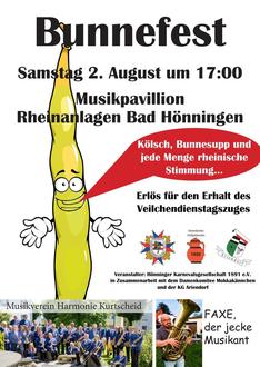 Wie in den vergangenen beiden Jahren wird zu Beginn um 17:00 Uhr ein Kurkonzert des Musikvereins Harmonie Kurtscheid stattfinden. Dieser konnte in den zwei Jahren mit seinem Konzert beim Bunnefest das Publikum begeistern, sodass die Ausrichter sich freuen, die Gruppe abermals in den Sommerferien verpflichten zu können.