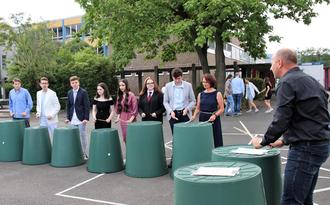 Nach zwei Jahren Corona, in denen die Abschlussfeiern nur mit sehr viel Distanz und wenig Publikum stattfinden konnten, fand an der Römerwall-Schule wieder eine traditionelle Abschlussfeier für insgesamt 51 Schülerinnen und Schüler mit ihren Eltern, Lehrern und Gästen statt. Den Auftakt bildete ein „Trashdrumming-Auftritt“ der BR-Abschlussklasse 9a unter Leitung von Musiklehrer Frank Gögler. Trotz der scheinbar bescheidenen klanglichen Möglichkeiten dieser „Instrumente“ - ganz normale Regentonnen - begeisterten die 24 Schülerinnen und Schüler sowie ihrer Lehrerin Petra Römer mit ihrem klangvollen Rhythmus und der Energie ihres Auftritts. Die offizielle Begrüßung und Moderation übernahmen Sinet Dippolt und Leon Bonnek. Anschließend trat Schulleiterin Marita Palm an das Mikrofon und hielt eine bewegende Ansprache über den Wert der Gemeinschaft und ließ die letzten Schuljahre Revue passieren. Nach dem Dank an die Lehrer sprach die Klassenleiterin Petra Roemer zu ihren Schülerinnen und Schülern. Gleichzeitig wünschte sie allen in einer emotionalen Rede für die Zukunft viel Glück und Erfolg. Nach der Übergabe der Zeugnisse wurde in diesem Jahr Elisa Müller für das beste Zeugnis der Klasse ausgezeichnet. Bevor es in die „Freiheit“ ging, verabschiedete sich die Klasse mit einer weiteren „Trashdrumming-Darbietung“ voller Präzision, Fantasie und Power.