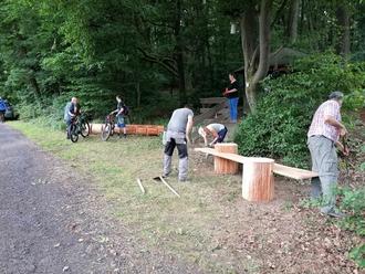 Nachdem engagierte Kolpingsmitglieder rund um die Kolpinghütte gesäubert, geschnitten und gemäht hatten, wurden am Samstag, 15.7.23 die beiden ausgefallenen Holzobjekte dort zusammen mit Stefan Kursch aufgestellt und in Szene gesetzt. Auch eine Aktionsfläche für das beliebte Tic Tac Toe wurde in den Boden eingelassen. Tic Tac Toe ist ein klassisches Spiel, das gerne auf Papier mit Kreuzen und Kreisen gespielt wird, hier aber mit Naturmaterialien gespielt werden soll, z.B. mit Steinen, Blättern, Zapfen, oder für die „großen“ Kinder mit Kronkorken diverser Getränke. Sowohl das Spiel, als auch der neue Fahrradständer und natürlich das Prachtstück von Bank wurden von allen Helfenden ausprobiert, Probe gesessen und mit viel Lob bedacht. Zur Zeit werden in Heimarbeit viele Kleinkunstobjekte hergestellt, die bis Oktober einen Platz auf dem zukünftigen Kleinkunstwanderweg finden werden.