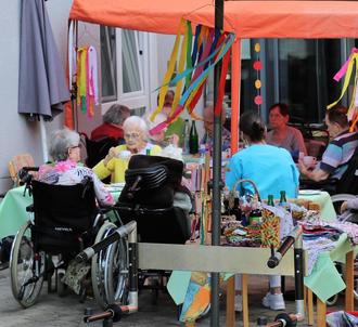 Angehörige und Freunde der Bewohninnen und Bewohner hatten sich zum Sommerfest angesagt und fühlten sich unter schattenspendenden Bäumen sichtlich wohl
