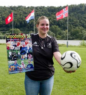 Bald ein Sommermärchen am Mittelrhein? Jasmin Höch vom SV Leutesdorf wirbt mit Plakat und WM-2006-Fußball „Teamgeist“ für das Festival „Woodstock 56“. Mit dem Reingewinn des Events soll die Nachwuchsförderung des Vereins gestärkt werden.