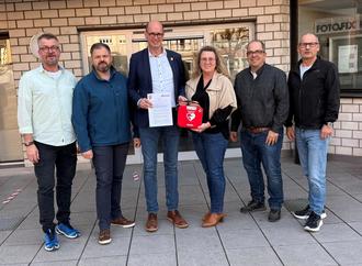 Die Bürgermeister in der Verbandsgemeinde Bad Hönningen unterstützen gerne das Projekt „Herzsicher“. V. l. n. r.: Jörg Jungbluth (OG Hammerstein), René Achten (Stadt Bad Hönningen), Jan Ermtraud (VG Bad Hönningen), Kerstin Wagner (Helfer-Stab gGmbH), Markus Konitzer (OG Leutesdorf), Oliver Labonde (OG Rheinbrohl)