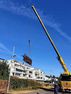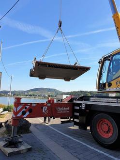 Mit Spezialkran und schwerem Gerät installierte man eine Anlegestelle für Niedrigwasser
