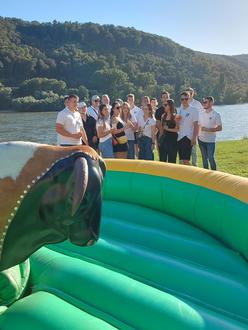 Bei hochsommerlichen Temperaturen begann der Kirmessamstag mit Bullenreiten. Zahlreiche Junggesellen, darunter natürlich auch der Vorstand, sowie Ehrendamen und Gäste versuchten ihr Glück. Am längsten schaffte es Robin Franz sich auf dem Tier zu halten! Ab 19 Uhr ging es mit der Kirmesparty und der Musik von „pink panta“ weiter. Dorfbewohner, ehemalige Leutesdorfer, einige Gastvereine und Kirmesfreunde aus nah und fern feierten gemeinsam.