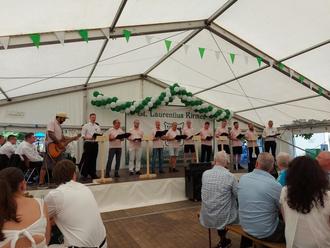 Der Kirmesmontag startete für die Leutesdorfer morgens um 6:00 Uhr, als sie durch Böllerschüsse geweckt wurden. Kurz danach hörte man den Junggesellenverein in Begleitung des Blasorchesters Bruchhausen durch das Dorf ziehen, um den Schützenkönig und ersten Vorsitzenden für den Kirchgang abzuholen. Der Festgottesdienst mit Pfarrer Magnus wurde von den Junggesellen mitgestaltet und zum Abschluss gab es Laurentiuswaffeln. Anschließend wurde der Kirmesspruch über das Dorf- und Weltgeschehen von Carlos Mertesacker auf dem Stein vor der Pfarrkirche vorgetragen und Fähnrich Johannes Hohn schwenkte gekonnt die Fahne. In einem großen Umzug zog der Verein, gefolgt von weiteren Gästen, zum Festzelt am Rhein, wo der Kirmeskommers stattfand. Nach Grußworten, musikalischer Unterhaltung durch die Bruchhausener, folgten Highlights wie die Auftritte der Männergesangsband Rheingoldkelchen.
