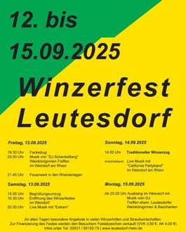 Leutesdorf. Alle Vorbereitungen laufen bereits für das diesjährige Winzerfest in Leutesdorf, welches vom 12.09.2025 bis 15.09.2025 stattfinden wird, auf Hochtouren. Freitag um 19:30 Uhr fällt der Startschuss mit dem traditionellen Fackelzug. Im Weindorf gibt es Live-Musik mit DJ Schenkelberg und zusätzlich ein Feuerwerk in den Rheinanlagen. Samstag öffnet das Weindorf um 16:30 Uhr und tritt die Band „Extrem“ auf. Um 14:00 Uhr startet sonntags der traditionelle Winzerumzug mit der neuen Weinkönigin Melina Riemenschnitter und ihrem Bacchus Karsten Selt. Im Weindorf wird anschließend mit der „California Partyband“ weiter gefeiert. Der Ausklang des Winzerfestes beginnt Montag um 20:00 Uhr im Weindorf mit DJ und ehemaligen Leutesdorfer Weinköniginnen und Bacchus. Zur Finanzierung werden den Besuchern Festabzeichen verkauft (VVK 3,50 €, AK 4,00 €).