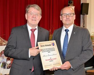 Der Ortsbürgermeister Oliver Labonde überreichte dem Gründungsgeschäftsführer der Firma Huber, Erwin Lötsch, an dessen 80. Geburtstag in feierlichem Rahmen im Römersaal die Ehrenbürgerschaft der Ortsgemeinde Rheinbrohl.