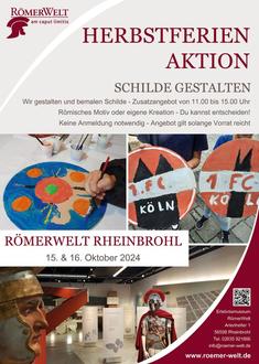 Wie gewohnt bietet die RömerWelt Rheinbrohl auch in den Herbstferien wieder eine kleine Zusatzaktion am Dienstag und Mittwoch, 15. und 16. Oktober an. Mit Unterstützung der Museumspädagogin geht es dieses Mal daran Schilde zu gestalten. Mit Acrylfarben können Jungen und Mädchen ihr eigenes rundes Schild bemalen. Verschiedene Vorlagen für römische Motive stehen zur Verfügung, aber spannender ist es, sich ein eigenes, individuelles Motiv zu überlegen. Diese Zusatzaktion bietet das Museum von 11.00 bis 15.00 Uhr.