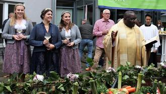 Der Sonntag des Rheinbrohler Weinfestes, begann mit einem feierlichen Gottesdienst und der Segnung der Erntegaben, durch Pater Magnus, mit anschließendem Frühschoppen auf dem Römerplatz. Doch zuvor erfolgte der alljährlich stattfindende Besuch im Seniorenheim St. Suitbertus. Die gesegneten Erntegaben, wie immer vom Winzer.- u. Bauernverband gespendet, wurden mit einem kleinen Umzug, in Begleitung der Cohors XXVI VOL.C.R und der niederländischen Kapelle „Joekskapel Schots en Scheif“ offiziell überreicht. Nach einigen Begrüßungsworten durch Alfons Rott vom Bauernverband und Mitgliedern des HVV, die mit sichtlicher Freude die Früchte des Feldes, zum Seniorenheim beförderten, hieß die Heimleitung Annette Scholl die Anwesenden, unter ihnen auch Pater Magnus, mit einem Schoppen Wein herzlich willkommen. Gleichzeitig dankte sie für die großzügigen Gaben, die später in der Küche großen Anklang finden sollten. Ebenso zeigte sie sich über die großartige Tradition, das Seniorenheim zum Erntedank zu besuchen sehr erfreut. Alfons Rott wies auf etliche Probleme in der Landwirtschaft hin, die es mehr und mehr in der Landwirtschaft erschwerten, gewinnbringend zu arbeiten. „Wir sind durch Einschränkungen wegen des Klimawandels, erschwerter Bürokratie, die Corona Pandemie, die uns bis heute beschäftigt, oder die verheerende Flutkatastrophe an der Ahr, sehr eingeschränkt,“ betonte Rott. „Und allem zum Trotz, zettelt ein größenwahnsinniger Präsident inmitten Europas einen völlig sinnlosen Krieg in seinem Nachbarland an. Die dadurch ausgelöste Wirtschaft.- und Energiekrise hat das Potenzial unseres kompletten Weltbildes auf gefährliche Weise verändern. Die Ernährungslage gerade für die armen Länder auf der Welt hat sich dadurch noch einmal mehr drastisch zugespitzt,“ so Alfons Rott mahnend. Gleichzeitig machte er klar, dass sich auch in unseren Breitengraden, finanziell schlechter gestellte Menschen berechtigte Sorgen machten, im Winter noch eine warme Stube zu haben und die erforderlichen Lebensmittel noch bezahlen zu könnten. Mahnende Worte, deren Akzeptanz sich im Applaus niederschlug. Nach dem offiziellen Teil, und einer Coronatestung, denn wegen des regnerischen Wetters ging es in die Innenräume des Seniorenheims, erhoben alle ihre Gläser und stießen mit den Gästen, unter ihnen auch Ortsbürgermeister Oliver Labonde, an.