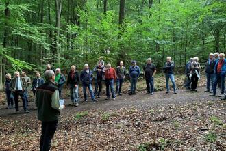 Förster Gregor Nassen erläutert einem interessierten Publikum, was in Zeiten des „Waldwandels“ die Schwerpunkte in der Waldbewirtschaftung sind. Mit dabei ist auch der Erste Kreisbeigeordnete Michael Mahlert (7.v.r.).
