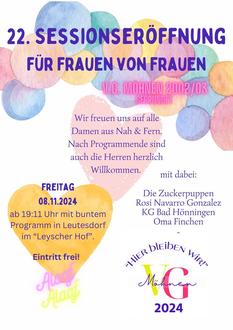 Die 22. Sessionseröffnung der VG-Möhnen, ein Zusammenschluss aller vier Möhnenvereine in der Verbandsgemeinde Bad Hönningen, findet am Freitag, dem 08. November 2024 ab 19.11 Uhr im Saal des Leyscher Hofes in Leutesdorf statt.
