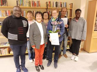 Die Geehrten mit Präses und Vorstand: Präses Pater Magnus Ifedikwa, Pia Ockenfels-Mehren, Brigitte Fink-Thoman, Ursula Hartung, Monika Oehl, Martin Stadtfeld und Freda Ehijie.