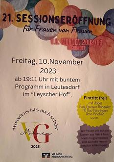 Die 21. Sessionseröffnung der VG-Möhnen, ein Zusammenschluss aller vier Möhnenvereine in der Verbandsgemeinde Bad Hönningen, findet am Freitag, dem 10. November 2023 ab 19.11 Uhr im Saal des Leyscher Hofes in Leutesdorf statt. Dazu lädt das Orga-Team der VG-Möhnen alle Damen aus nah und fern ganz herzlich ein. Ein Programm mit den besten Vorträgen, Tanzgruppen, Auftritten der kleinen Tollitäten und mit viel Musik und Gesang wartet auf alle, die die fünfte Jahreszeit schon sehnsüchtig erwarten und nun endlich wieder ausgelassen miteinander singen, schunkeln und tanzen wollen. Es gibt lecker Kölsch und Erdinger Helles, Sekt und natürlich Pfirsichlikör und vieles andere mehr.