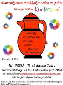 Die Karten können für 9,50 € ab Montag, 11.11.2024 online über damenkomitee.mokkakaennchen@gmail.com oder bei jeder Aktiven erworben werden.