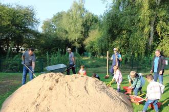 So gab es eine Straße von Schubkarren vom Sandhaufen hinter dem Kita-Gelände zu der Nestschaukel und zurück. Als die Kinder gegen Ende der Arbeit auch noch auf den großen Schubkarren mitfahren durften, war die Freude besonders groß.