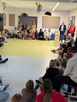 Die Cafeteria war prall gefüllt und spannend lauschte man den Worten von Jan Ermtraud, der seine Rede mit einer einfachen Frage begann. „Schmeckt Euch denn das Essen, liebe Kinder?“ - ein lautes „jaaa“ erfüllte sofort den Raum. Jan Ermtraud bedankte sich nicht nur bei Herrn Himmelbach und seinem motivierten Team, sondern auch ganz besonders bei den „Pänz“ der KiTa St. Suitbert. „Die strahlenden Gesichter, die täglich gezeigt werden, sind wohl die größte Anerkennung für das gut schmeckende und vor allem sehr gesunde Essen, welches hier serviert wird“ lobte Jan Ermtraud das Konzept der Ernährungskita und gab sogleich das Wort an Herrn Himmelbach.