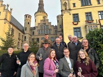 Gemeinsam mit den Mittelrhein-Weinhoheiten, Winzern der Region und Schlossherr Christian Runkel hoffen die Landräte Achim Hallerbach und Sebastian Schuster auf guten Zuspruch zum ersten Winter-Wein-Date am 7. Februar 2025 auf Schloss Arenfels.