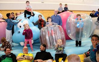 Nicole Emmler und Bürgermeister Jan Ermtraud inmitten der Kinder auf der Hüpfburglandschaft