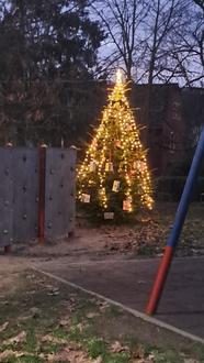 Am Donnerstag, 28.11.24, wurde der Baum, der von den Mitarbeitern des Bauhofs geliefert wurde, mit Lichtern und Päckchen geschmückt und steht jetzt als wunderschöner Weihnachtsbaum auf dem Schulhof.