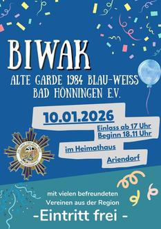 Am Samstag, den 10.01.2026, findet der jährliche Biwak der Alten Garde 1984 Blau-Weiss Bad Hönningen e. V., im Heimathaus in Ariendorf statt.