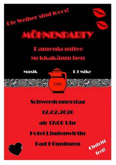 Das Damenkomitee Mokkakännchen lädt alle Karnevalsfreunde zur Möhnenparty am Schwerdonnerstag ein. Start ist um 17:00 Uhr, Einlass ab 16:00 Uhr, der Eintritt ist frei. DJ Mike sorgt für Stimmung. Prinzessin Sabine, Kinderprinz Joel und die KG Bad Hönningen kommen als Gäste, außerdem gibt es kleine Programmpunkte. Das Damenkomitee Mokkakännchen freut sich auf viele Jecken.
