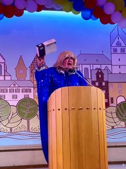 Als blonde Diva mit funkelnden Paillettenkleid bahnte sich Werner Heinz, ein humoristisches Urgestein erster Güte, den Weg durchs Publikum hin zur Bühne.