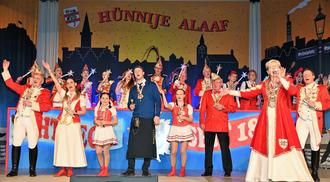 Anlässlich des "11 x 11 un' 11"-jährigen närrischen Geburtstages der KG widmeten die Hünnijer Narren dem besonderen Ereignis das emotionale Lied "Hünnije Alaaf heißt: Mir sinn Eins". René Breitenbach sorgte zwischen dem „Hohen Haus und dem Hase-Eck“ mit einem eigenen Showprogramm aus kölschen Liedern wieder einmal für Furore. Mit "Wir leben auf beiden Seiten des Limes und zusammen feiern wir Fastelovend", sorgte er gar Gut Will zwischen Rheinbrohl und der Badestadt. Für Begeisterung sorgte Jessica Ley, das „Feuerfünkchen aus Saffig“. Ebenso wie das humoristische Urgestein Jürgen Bönder, der mit Anke Vogel im wahrsten Sinne des Wortes den „Vogel“ abschoss. Gäste von der anderen Rheinseite, aus Remagen und Hürth-Gleuel zeigten sich „funkenmäßig Spitze drauf und die "Ahrtalente" übernahmen dann das Programm und beendeten mit peppiger Musik das über 5-stündige Programm der diesjährigen Prunksitzung der Hönninger Karnevalsgesellschaft.