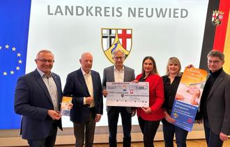 Landrat Achim Hallerbach freute sich über die Spende des Lions-Club Neuwied-Andernach mit Wolfgang Sulzbacher und Präsident Oliver Mühmel ebenso wie Olga Scott (Caritasverband Neuwied), Simone Höhner (Kreisjugendpflege) und Jürgen Ulrich (Leiter Kreisjugendamt Neuwied).