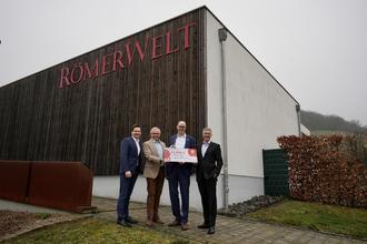 „In diesem Jahr blicken wir auf 20 Jahre UNESCO-Welterbe-Status beim Obergermanisch-Rätischen Limes auf unserer rechten Rheinseite zurück. Im Verbund mit dem Niedergermanischen Limes gegenüber knüpfen hier in Rheinbrohl sozusagen zwei historische Grenzverläufe aneinander an. Unsere RömerWelt hat also eine Brückenfunktion, die mit der Vergrößerung der Ausstellungsfläche noch besser wahrgenommen werden kann. Das erhöht wiederum die Strahlkraft unseres Alleinstellungsmerkmals für römische Geschichte im damaligen Germanien“, betonte Landrat Achim Hallerbach bei der Scheckübergabe. Vor Ort waren ebenfalls der Vorstandsvorsitzende der Sparkasse Neuwied Thomas Paffenholz, Vorstandsmitglied Marc Sinkewitz und der Bürgermeister der Verbandsgemeinde Bad Hönningen, Jan Ermtraud.