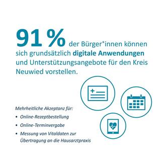91 Prozent der befragten Bürger im Kreis Neuwied können sich grundsätzlich digitale Anwendungen und Unterstützungsangebote im Gesundheitsbereich vorstellen. Das ist das erste Ergebnis einer breit angelegten Befragung im Rahmen des Pilotprojekts „MeineGesundheit - Digital.Nah.Neuwied“, das Landrat Achim Hallerbach jetzt vorstellte. Insgesamt haben sich 3.444 Bürger aus dem Kreis Neuwied an der von Wissenschaftlern der „Digitalen Modellregion Gesundheit Dreiländereck“ (DMGD) der Universität Siegen entwickelten Bürgerbefragung beteiligt. Hinzu kamen 31 Experten-Interviews.