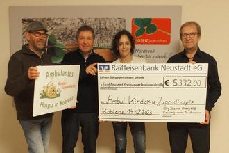 Am Donnerstag, dem 14. Dezember reisten der Vorsitzende der Big Band, Thomas Kaballo und der Vorsitzende des Gesangvereins Thalhausen, Friedhelm Kurz mit dem Dirigenten Wolfgang Fink nach Koblenz. Dort übergaben sie insgesamt 6.500 Euro an Katja Masendorf vom Ambulanten Kinder- und Jugendhospiz. Der Betrag setzt sich zusammen aus 5.332 Euro aus dem Konzerterlös plus 1.168 Euro aus den Spendendosen, die an den Konzerttagen aufgestellt waren.