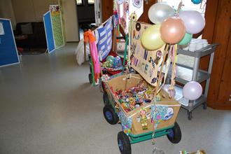 An einigen weiteren Stopps füllten sich unsere Bollerwagen mit leckeren Sachen. Wir konnten auch einige kostümierte Zuschauer am Straßenrand begrüßen. Zwischendrin wurde getanzt und gesungen und fleißig Kamelle gesammelt.