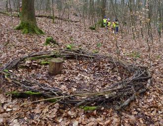An Tag eins, hatte die erste Gruppe die Aufgabe das Waldsofa wieder aufzubauen. Dafür sammelt man Äste und Zweige, die man am Boden findet und legt sie kreisförmig an, bis das Endergebnis einem überdimensionalen Vogelnest gleicht. Anschließend konnten die Kinder darauf sitzen und ihr selbstmitgebrachtes Frühstück verputzen. Danach ging es auf Erkundungstour.
