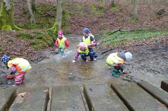 Ein großer am Boden liegender Ast lud zum Balancieren ein. Ein weiterer Ast, wippte auf und ab, wenn man sich darauf setzte. Doch die größte Anziehungskraft hatte der wienauer Bach.