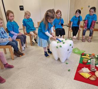 Gemeinsam sortierten die Schukis gesunde und ungesunde Lebensmittel und erfuhren, welche Auswirkungen diese auf ihre Zähne haben.