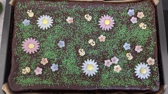 Auf dem Buffet stand sogar ein selbstgemachter Kuchen in Form einer Frühlingsblumenwiese, der sofort die Aufmerksamkeit aller auf sich zog.