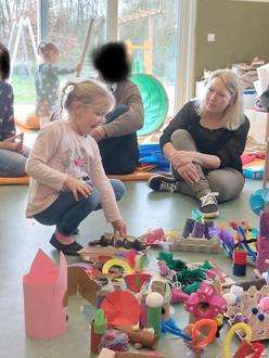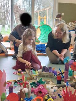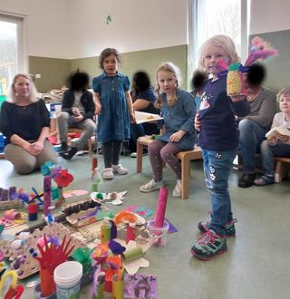 Da in der Kita zu dieser Zeit die Spielzeugfreie Zeit stattfand, ging es an diesem Nachmittag darum, aus Alltagsmaterialien wie Pappe, Becher, Eierkartons, Dosen etc. etwas zu gestalten. Es entstanden tolle Kunstwerke, wie zum Beispiel Osterhasen, Blumenvasen oder Girlanden, die zum Schluss in einer gemeinsamen Runde in der Turnhalle präsentiert wurden.