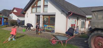 Rindenmulch mit Schubkarren unters Klettergerüst und den Nestspielplatz gefahren und verteilt. Wände und Platten abgespritzt. Das Spielhaus teilweise geschliffen und gestrichen sowie die „Blumen Paletten“ an der Wand bunt gestrichen.
