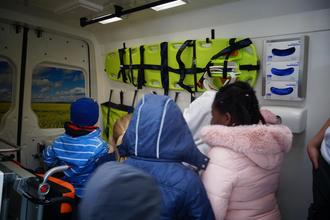 Anschließend durften die Kinder von innen schauen, wie der Wagen aussieht. Das Blaulicht und die Sirene wurden auch angeschaltet.