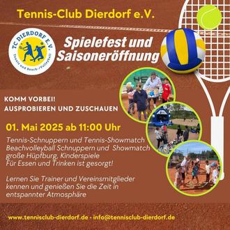 Am 01.05.2025 lädt der Tennis-Club Dierdorf e. V. ab 11:00 Uhr herzlich zum großen Spielefest mit Saisoneröffnung auf die wunderschön gelegene Anlage hinter dem Aquafit Dierdorf ein.
