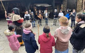 Ende April war die Ehrenburg im Hunsrück das Ausflugsziel für die rund 300 Kinder der Gutenberg-Schule. Am Burgtor angekommen, wurden sie von mittelalterlichen Mannen eingelassen, die die Klassen zu Turniergesellschaften machten, indem sie ihnen Standarten mit Wappen überreichten. Und so bevölkerten Drachen, Einhörner, Adler, Löwen und viele mehr den Hof der Ehrenburg und wurden in einen Wettstreit gegeneinander geschickt.