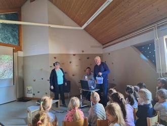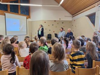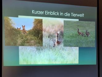 Wie von dem Fuchs, der von der Familie Nilgans mit Geschnatter und Wasserspritzern verscheucht wurde. Oder den kleinen Wieseln, die ausgelassen vor ihm auf dem Spazierweg tollten. Auch die kleinen Füchse waren neugierig und kamen so auf das Bild. Ebenso wie Feldhasen, Eichhörnchen und Rehe. Bei den Vögeln konnte er uns die verschiedenen Meisenarten zeigen. Vögel, die bei uns zu Hause sind und die wir auch schon am Futterhaus vor der Bärengruppe gesehen haben oder dem Rotmilan, der über dem Kindergarten seine Kreise zieht. Aber auch ganz scheue und seltene wie den Schwarzstorch, den Eisvogel und den Schwarzspecht. Zum Abschluss zeigte er uns Bilder, wie sich ein Rotmilan einen Frosch aus einem Weiher schnappte. Das war ein faszinierender Vortrag mit unglaublich schönen Bildern.