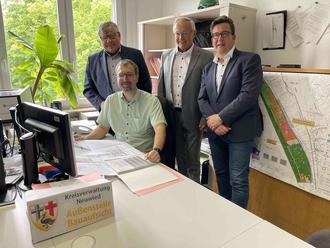 Fabian Schloms (sitzend) von der Bauaufsicht der Kreisverwaltung bieten künftig an jedem ersten Mittwoch im Monat eine Bauberatungs-Sprechstunde in der VG-Verwaltung Linz an. Darüber freuen sich (von links) Kreis-Beigeordneter Michael Mahlert, Landrat Achim Hallerbach und der Linzer VG-Bürgermeister Frank Becker.