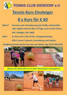 Der Tennis-Club Dierdorf hat aufgrund der Nachfrage ein neues Angebot aufgestellt: "Viele Interessierte kommen auf den TCD zu und wollen den Tennis-Sport in kurzer Zeit erlernen oder intensiv an der Technik arbeiten um diese zu verbessern!", so DTB Trainerin Uli Wilden. Hier bietet der TCD 8 Kursstunden in einer 4er Gruppe an, wöchentlich oder täglich intensiv über 14 Tage, auch in den Ferien.
