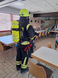 Damit die Kinder sich das besser vorstellen konnten, zeigte uns Andi, wie ein Feuerwehrmann in ganzer Ausrüstung mit Atemschutz aussieht.